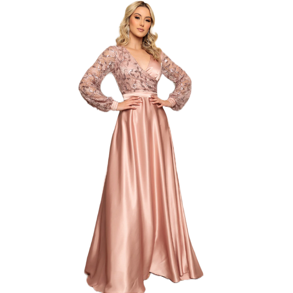 A saia fluida e rodada acrescenta movimento gracioso ao vestido, garantindo uma silhueta elegante e sofisticada. A escolha do material em cetim eleva o traje a um patamar de luxo, proporcionando um caimento impecável e uma sensação de suavidade ao toque.